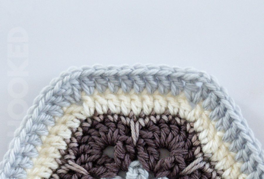 Notice the sixth and seventh rounds of stitches (in the cream and gray yarn). In the sixth round, there are nine double crochets between the corner chains. And on the seventh round, there are ten double crochets between the corner chains.