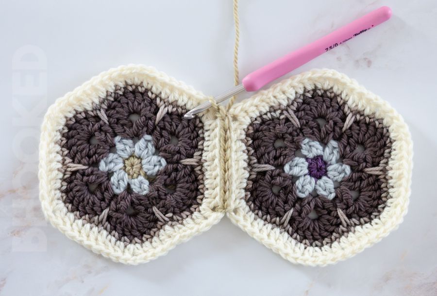 Another classic join for these hexagons is the invisible seam. With this join, you get a “fused at the edges” look so the flowers can be the star of the show. It comes together pretty quickly with a yarn needle so you can get to the fun part of enjoying your project sooner.