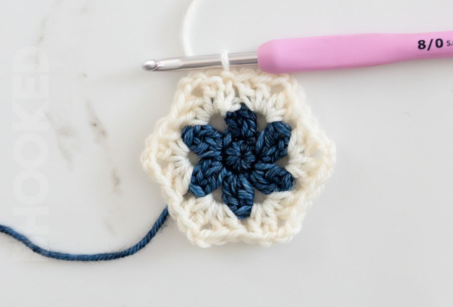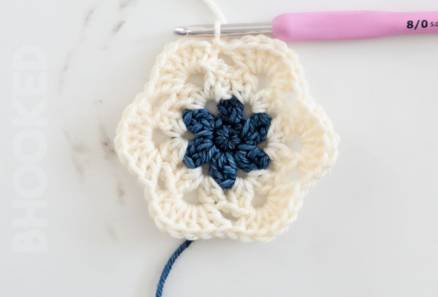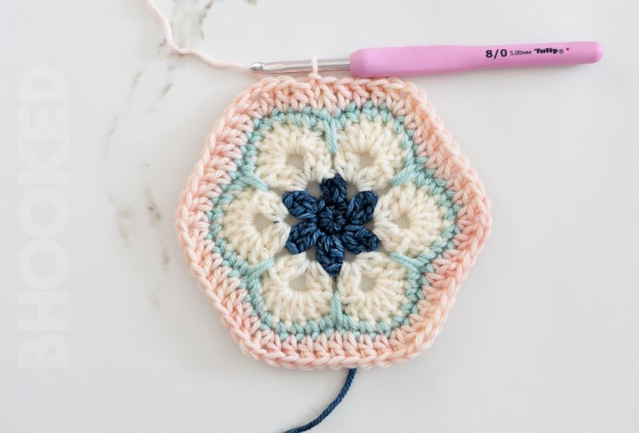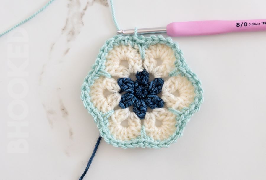 From one round to the next, the stitch combination for each corner (dc, ch 2, dc) remains the same. So what makes one round different from the next is the number of double crochets between each corner. As your African flower hexagon grows, the number of double crochets between the corner chains increases by one.