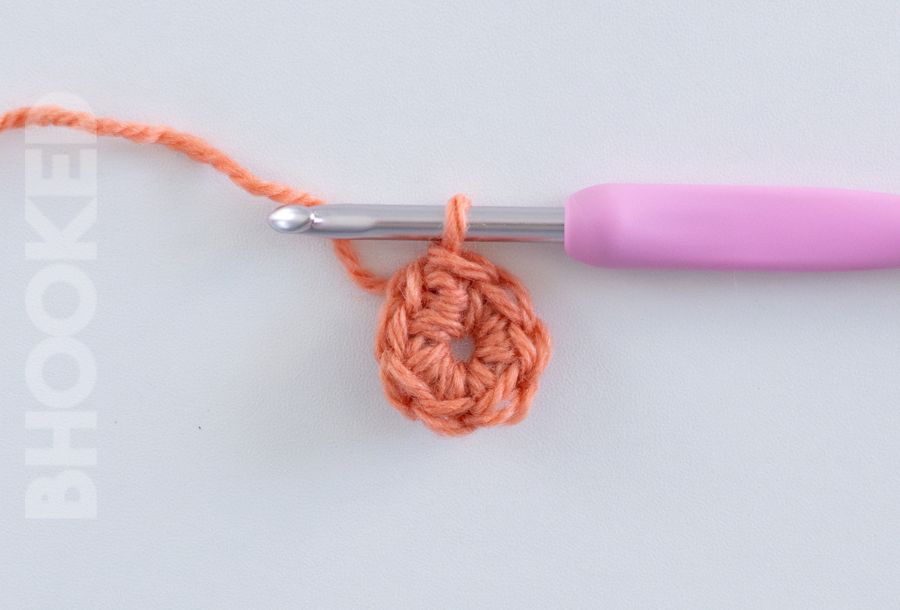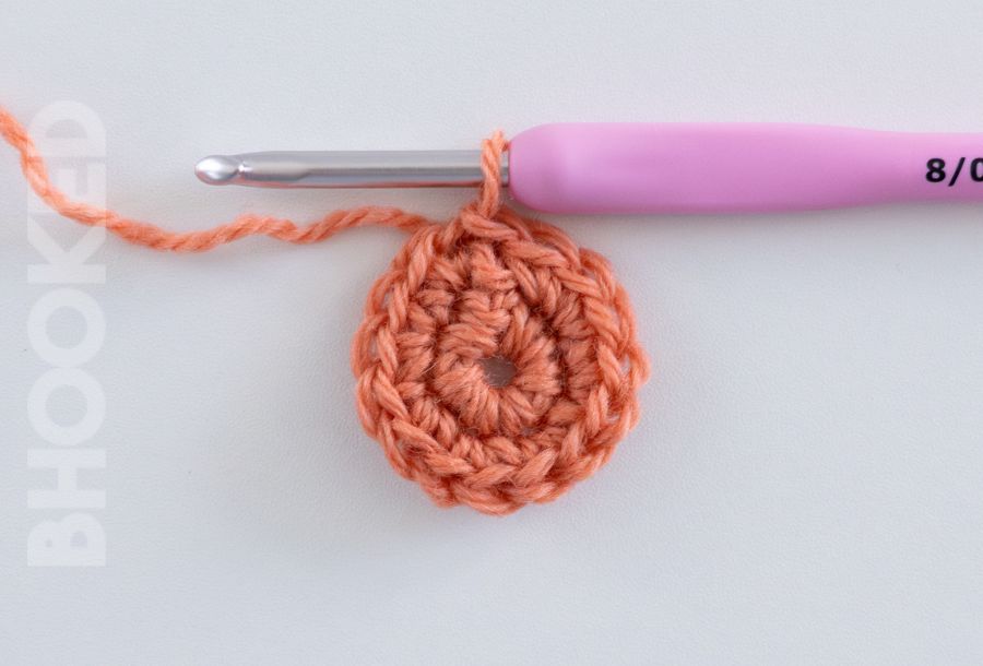 Round 1: Ch 4. Slst to the first ch to join the round. Ch 1 (doesn’t count as a st) and make 7 sc in the center of the ring. Slst to the first sc to join the round. (7 sts)