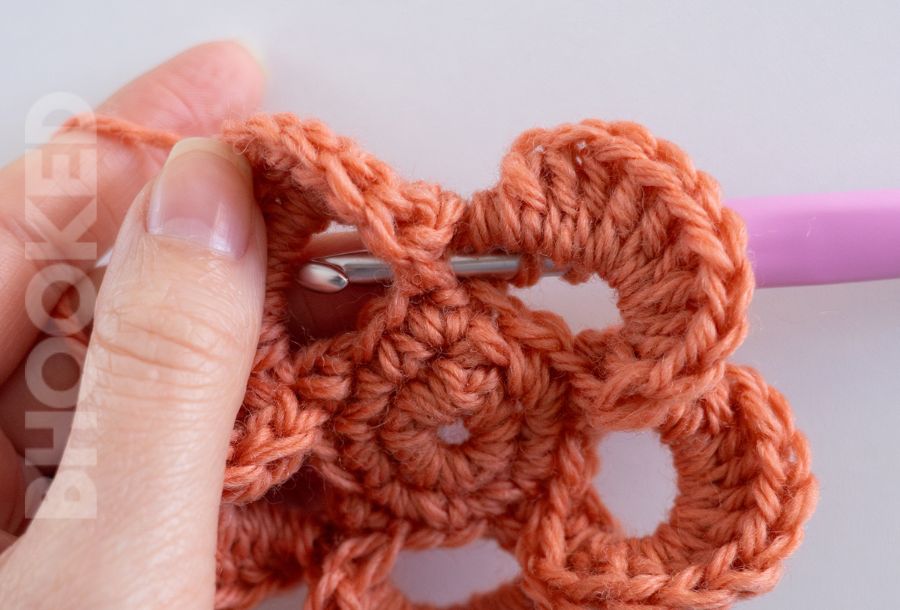 *Ch 3. Then remove the hk from the loop. Then insert the hk in the sc next to the dc (near the join from the previous petal) in the prev round. Keep the hk behind the chain, and pick up the loop. Then pull the loop through the st.