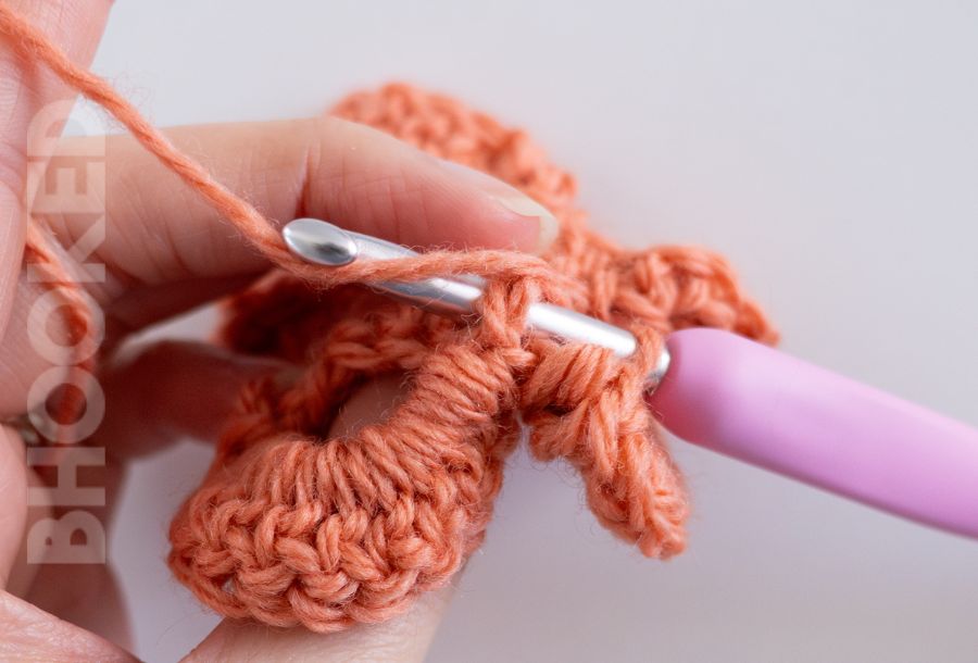 Place the hk in front of the next dc (similar to a back post double crochet), YO and pull through the loop on the hk to secure the petal to the back. (Tutorial minute mark: 16:03)