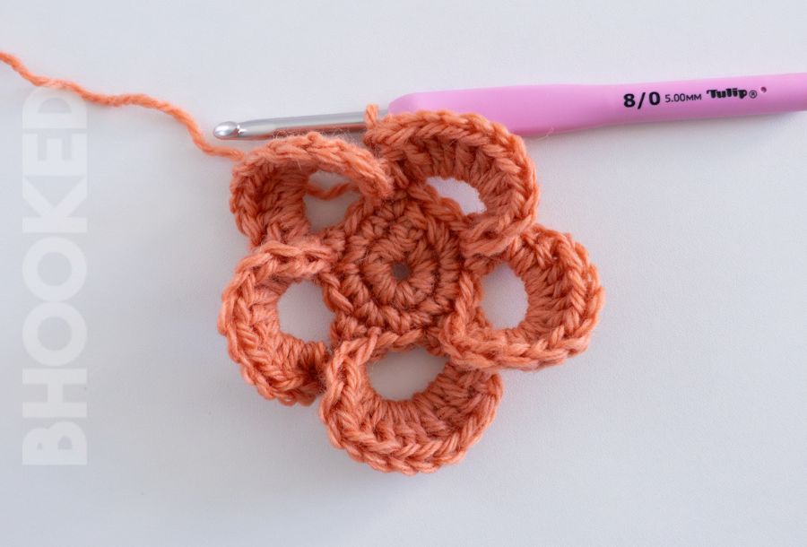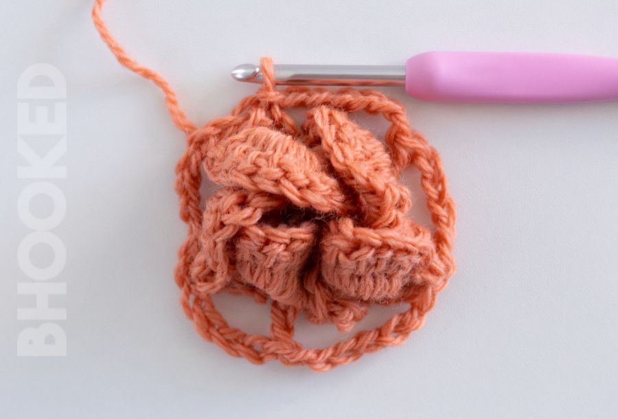 *Ch 3, and remove the hk from the working loop. Then insert the hk in the same sc as the next dc from round 5. Keep the hk in front of the ch, pick up the working loop, and pull it through the st. Then make 16 dc in the ch 6-sp. Then place the hk in front of the next dc from back to front (similar to a back post double crochet), then YO and pull through to secure the petal to the back. Rep from * three more times for a total of 5 petals. (Tutorial minute mark: 17:43)