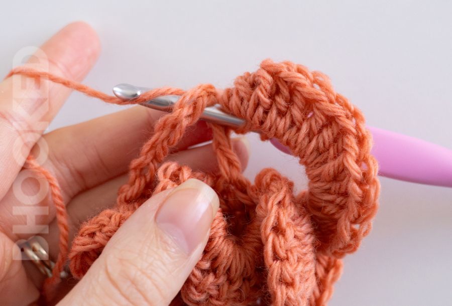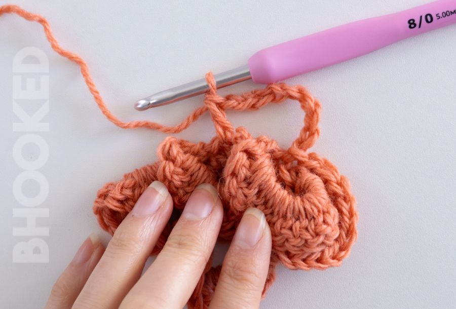 Place the hk in front of the next dc from back to front (similar to a back post double crochet), then YO and pull through the loop on the hk to secure the petal to the back. (Tutorial minute mark: 06:47)