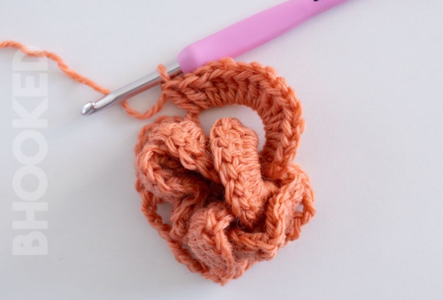 Make 12 dc in the ch 4-sp. Then place the hk in front of the next dc from back to front (similar to a back post double crochet), YO and pull through to secure the petal to the back. Rep from * three more times for a total of 5 petals. (Tutorial minute mark: 09:15)
