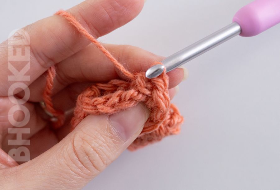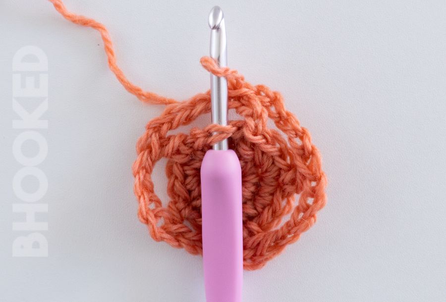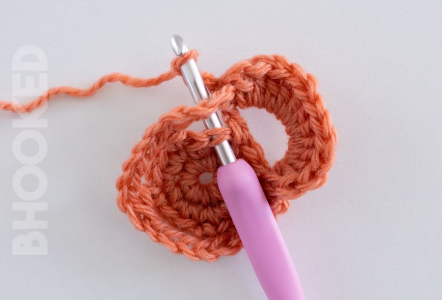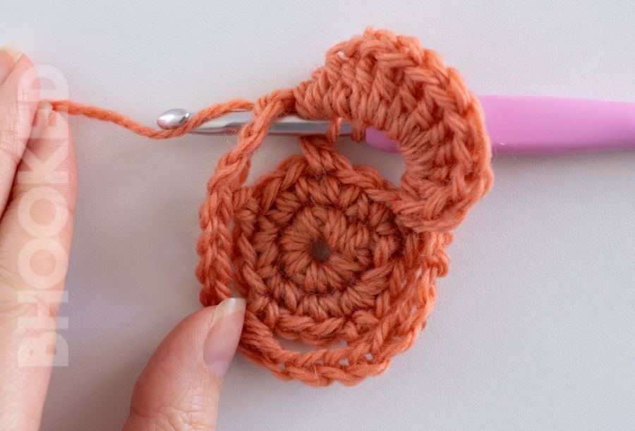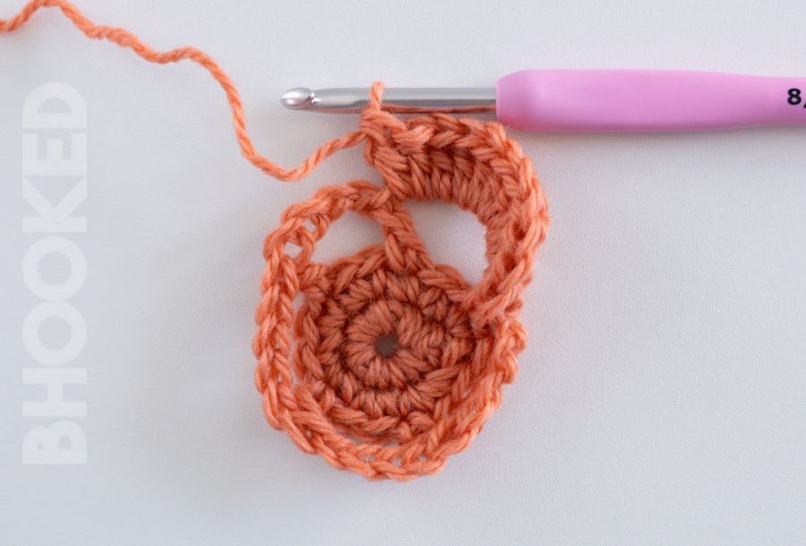 Round 4: Insert the hk in the sc directly next to the ch 3 of the prev round. Keep the hk in front of the ch, and pick up the working loop. Pull this loop through the st.