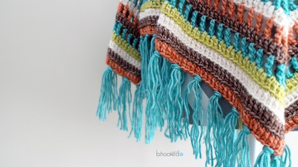 In order to maintain the proper gauge, you will need to choose a worsted (aran) weight yarn. The pattern is versatile enough that just about any yarn in this weight category will work. You may choose multiple colors like I have done for the demo ponchos, work it in a solid color or even use a variegated or self striping yarn to get a colorful effect (without all those pesky ends to weave in). The sky is the limit here, have fun with it!