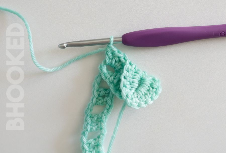 Sk the first group of 2 dc (that are right under your hook). Then make 5 dc down the next dc post. Ch 1 and rotate the work 180 degrees counter clockwise (clockwise if left-handed).