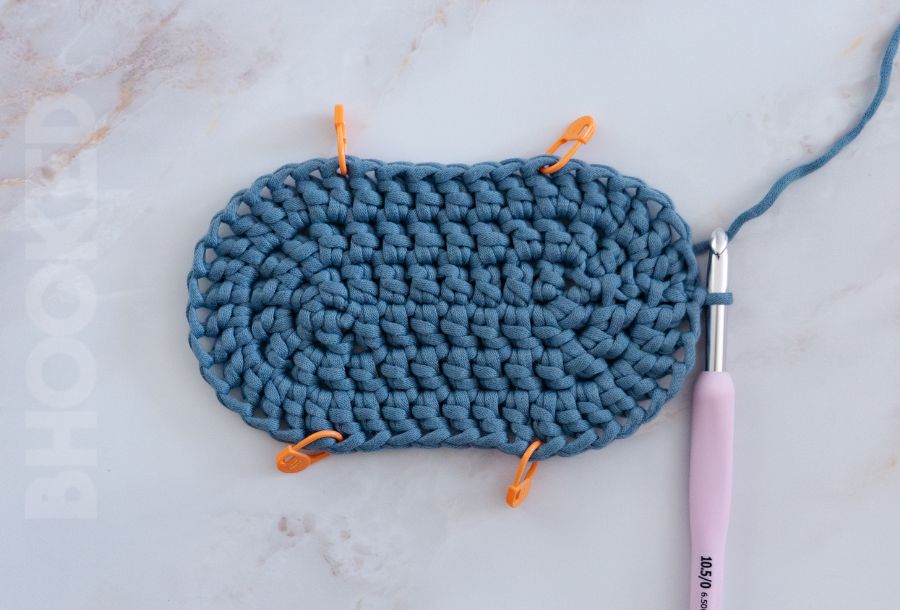 In order for the crochet oval to lay flat, you must evenly space the increases at each end between the stitch markers. And there’s an easy was to remember this. For each round after 5, the number of stitches between each increase increases by one.