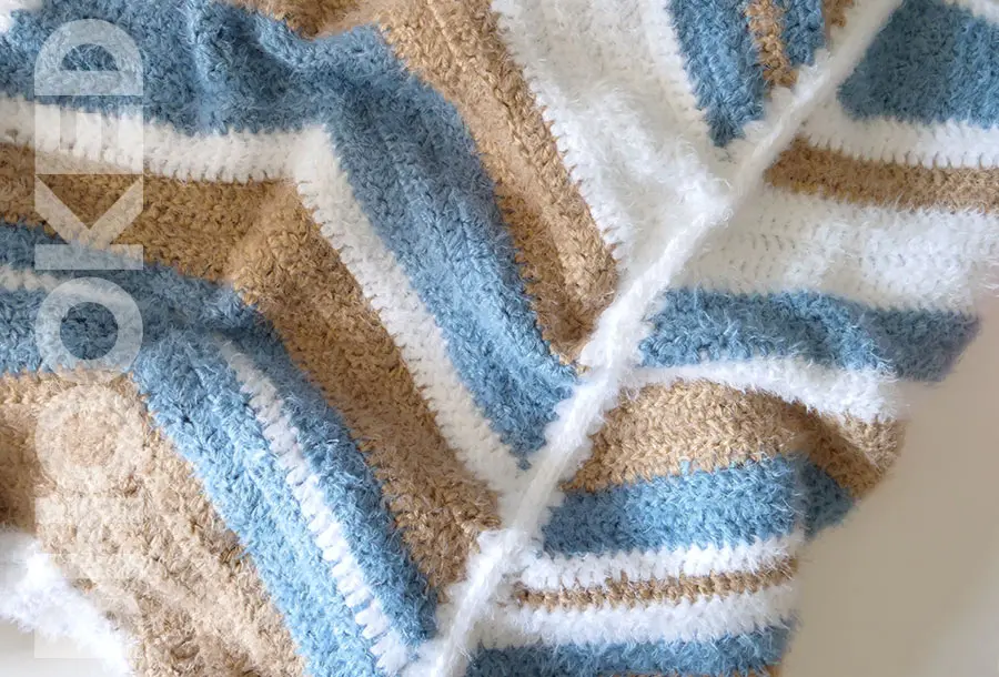 Additional Notes: This blanket is worked in three separate panels and joined together. Each panel uses the same stitch pattern with a different stripe pattern. Use the written instructions for the stitch pattern and refer to the color pattern for each panel.