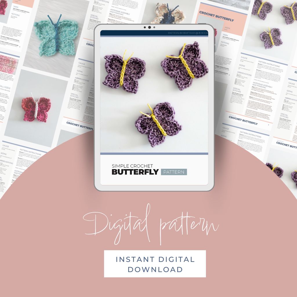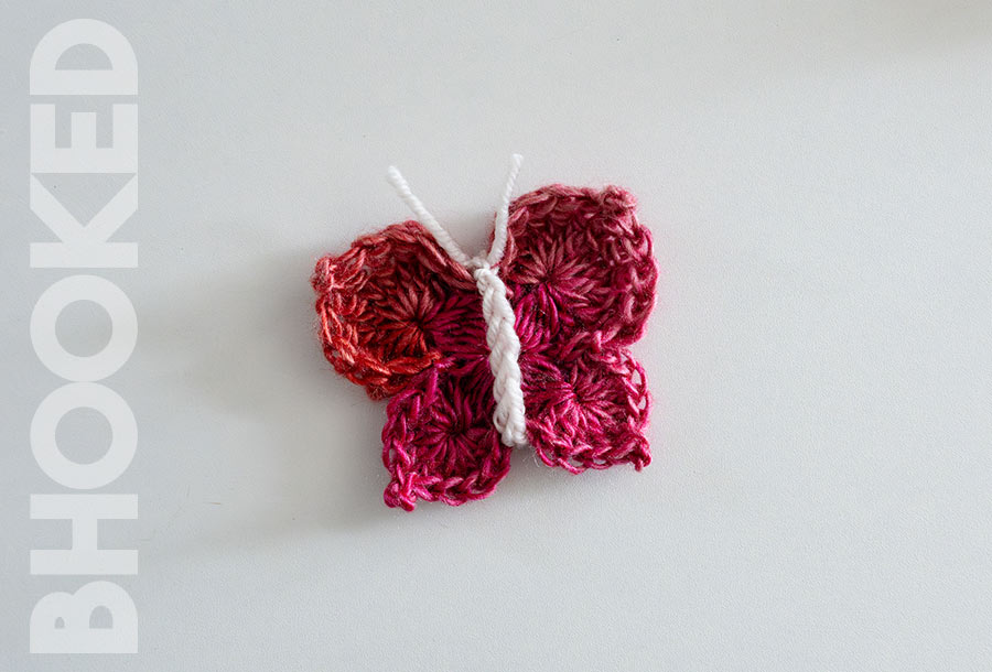 This crochet butterfly is crocheted in two rounds, and the body/antennae are added separately. When you use a medium-weight yarn and the recommended hook size, your crochet butterfly will measure about 3.25″ at the widest point, and about 3″ from top to bottom. If your measurements aren’t exactly the same, there’s nothing to worry about.