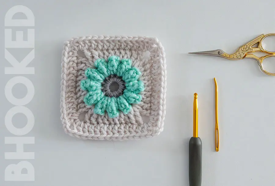 The flower in this granny square was derived from our popcorn stitch flower, another flower favorite you should check out if you haven’t seen it already! Popcorn stitches are great for this flower because they are raised more than a puff stitch for example.