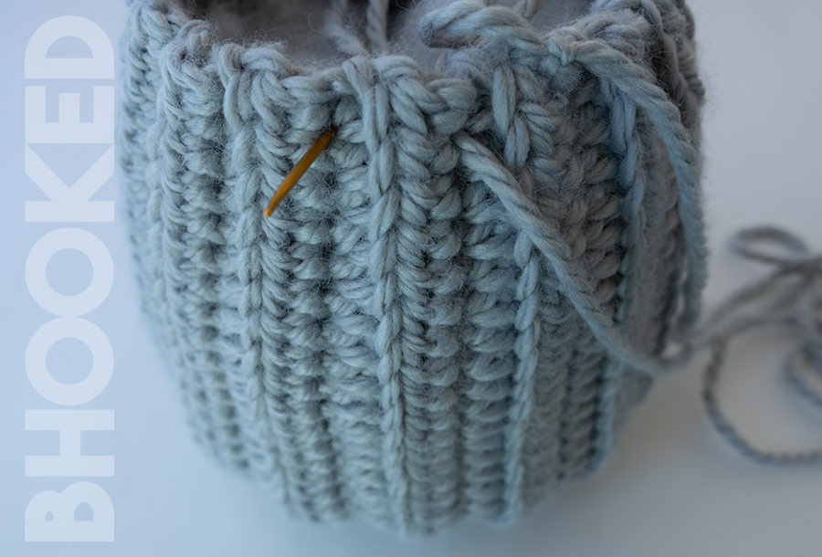 Step 3: To create the first drawstring closure, run the yarn in and out as seen in the photo.