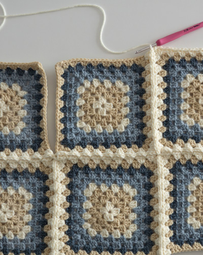First, decide how you want your granny squares to be arranged in your project. Start with the bottom right square (or bottom left if you’re left-handed).