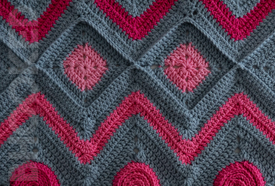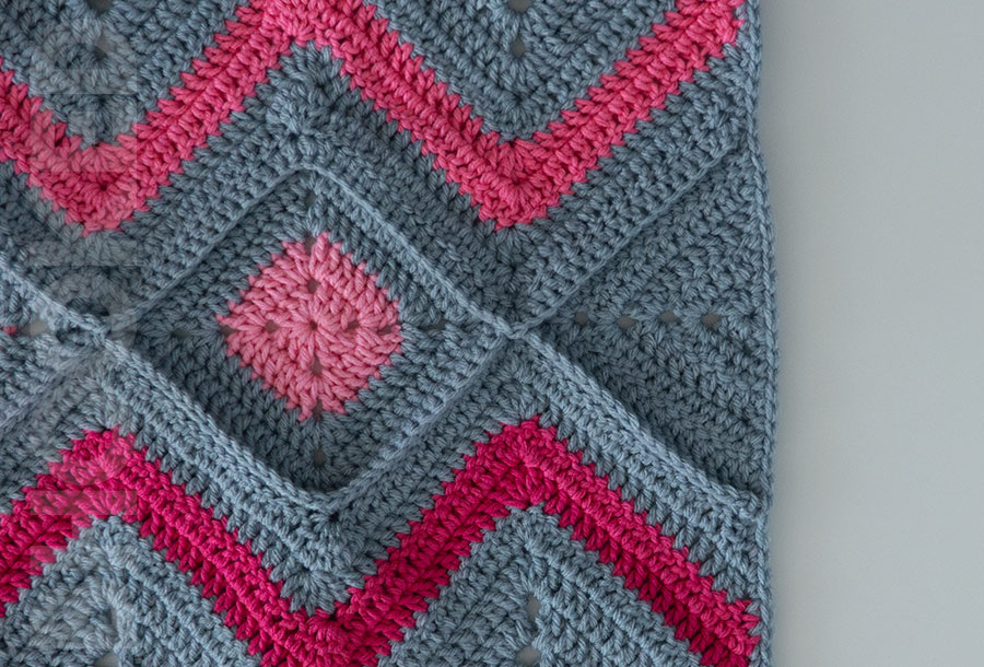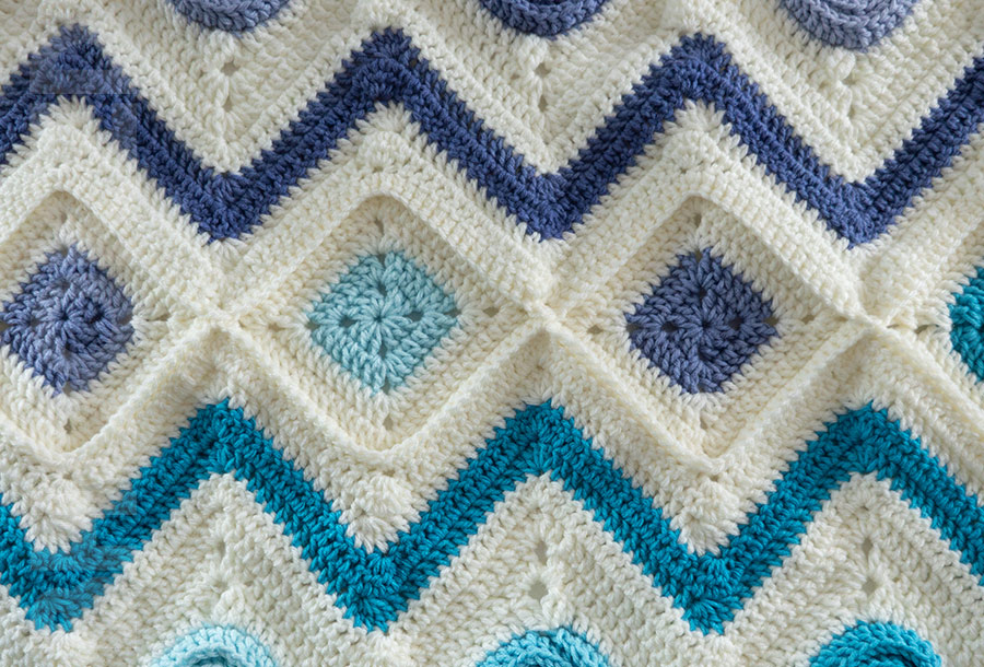 Putting this blanket together is so much fun! You’ll make squares and chevron rows that form four panels, which are then joined to complete the blanket. Projects like this are perfect for a challenge because they use different techniques, keeping things exciting from start to finish.