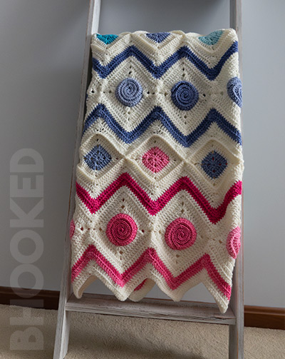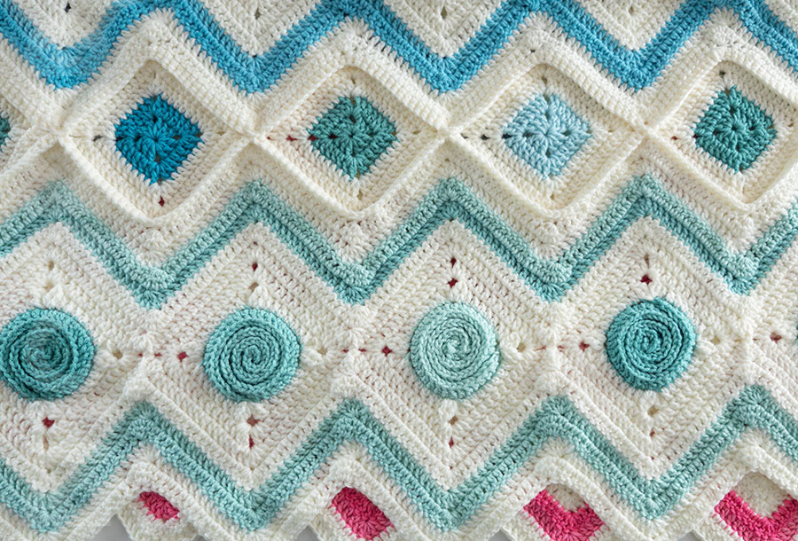 Each chevron panel is made up of 7 spiral squares, and a chevron stitch pattern on the top and bottom, framing the squares.