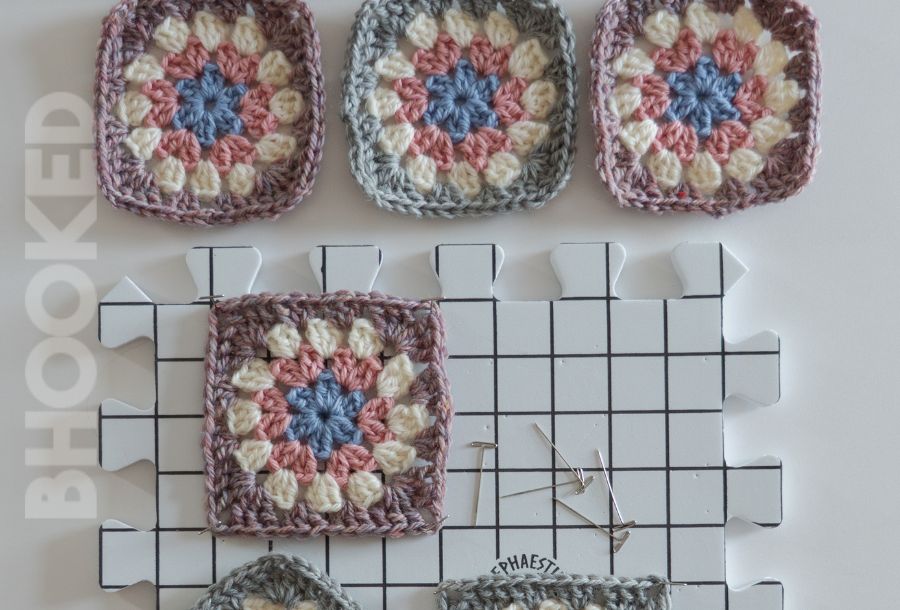 Blocking is pretty simple. First, get your squares wet by dunking them in water or spraying them with a spray bottle. Then gently squeeze out the extra water and pin the square onto a blocking mat so it’s perfectly square. While you do this, gently stretch it a bit to make the stitches settle into place. As it dries, it’ll keep that nicer shape. If you want more info on blocking, check out my guide here.