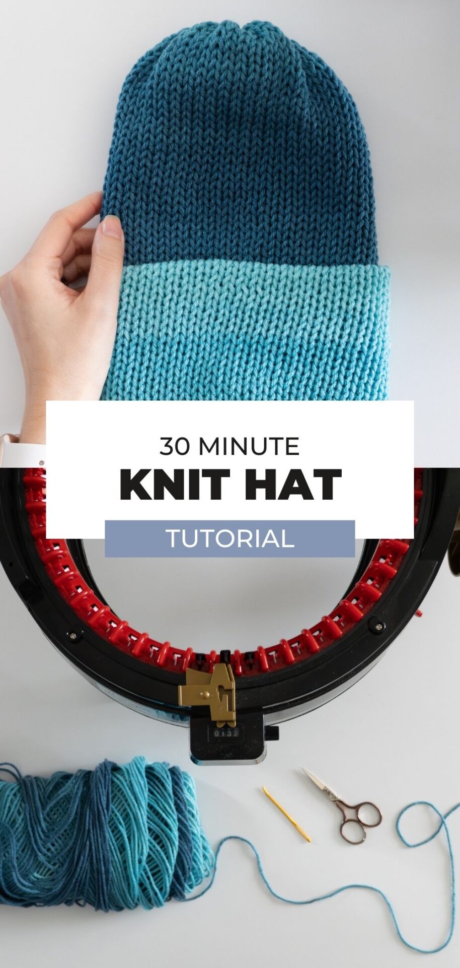 - Hat knitting machine – A circular knitting machine like this 46-pin Addi Express King Size. (Make sure yours has enough needles to fit an adult-sized hat—usually 40+ pins.)