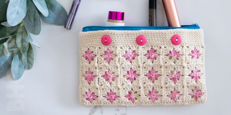 This project combines classic crochet with a modern twist—granny squares stitched right onto a canvas zipper pouch. It’s a fun, functional gift that’s totally unique and eliminates the need for a liner. Great for makeup, hooks, or travel essentials.