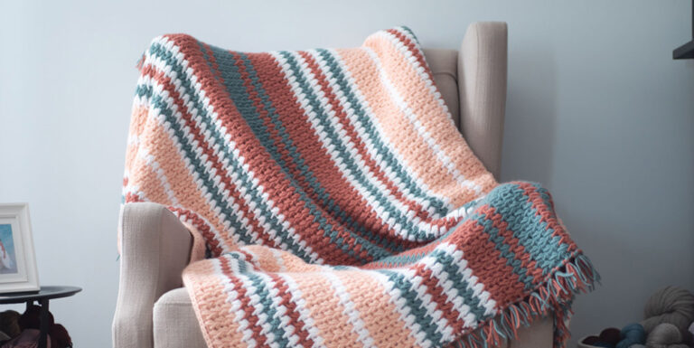 With clean lines and bold stripes, this blanket has a fresh, modern look. It uses basic stitches and color changes for a project that’s simple but striking.