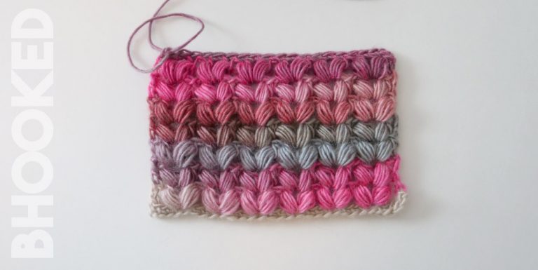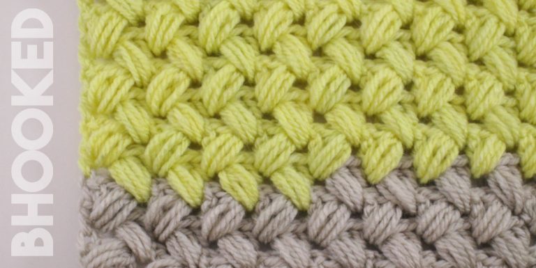 Combining puff stitches in a V shape gives this pattern a soft, bouncy texture with a delicate look. It’s perfect for baby items or light, cozy accessories.